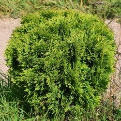 Изумрудная летом и чуть бронзовая зимой, эта шаровидная туя всегда остаётся выразительной. Даже в снежном саду она добавляет цвет и жизнь, создавая впечатление вечнозелёного пространства.