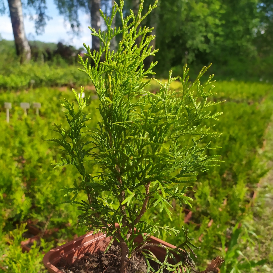 Крона компактная, симметричная, диаметром до 1,8 м. Хвоя - вечнозелёная, чешуйчатая, блестящая, насыщенного изумрудного оттенка, сохраняет цвет в течение всего года. Благодаря этому ваш сад будет выглядеть ухоженным и живым даже зимой. Плоды - округлые коричневые шишечки длиной около 0,7 см.