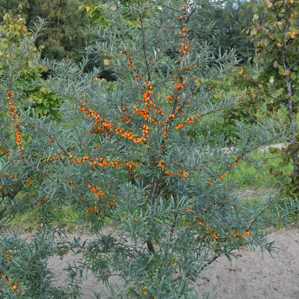 Средневысокий кустарник с серебристо-зелёной листвой и ярко-оранжевыми съедобными ягодами, формирующими плотную колючую живую стену. Лечебные ягоды.