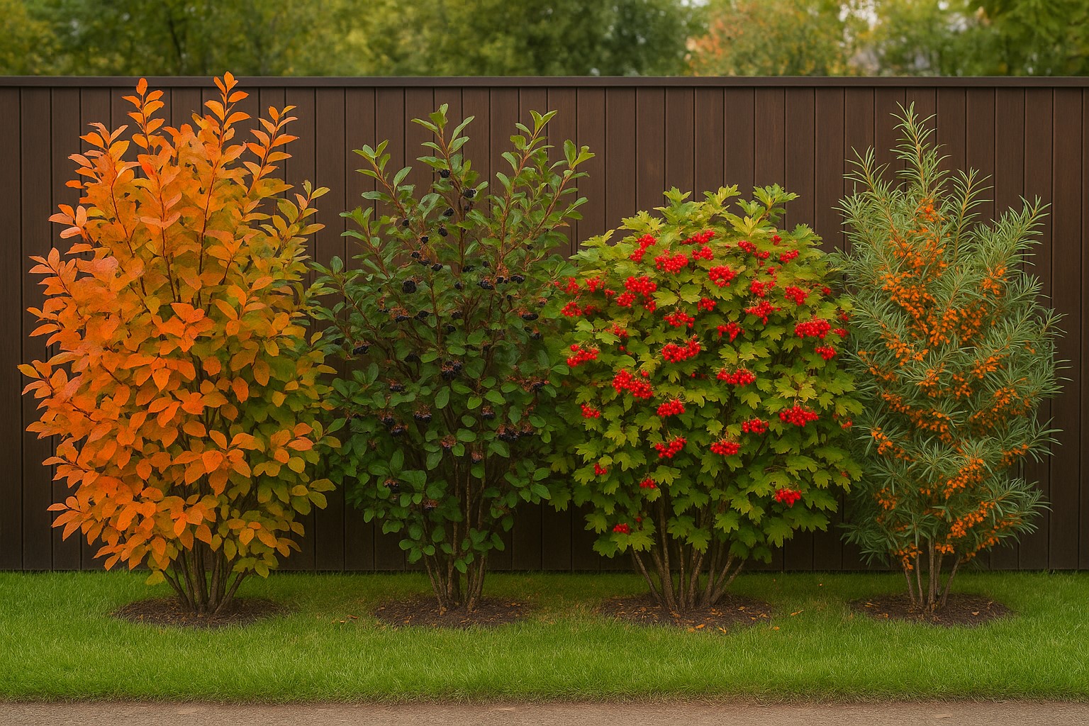 • Листва: Арония - глянцевые тёмно-зелёные листья, осенью становятся бордовыми. Калина - летом тёмно-зелёные, к осени пурпурные. Облепиха - серебристо-зелёная. Ирга - зелёная, осенью бронзовая и долго не опадает.