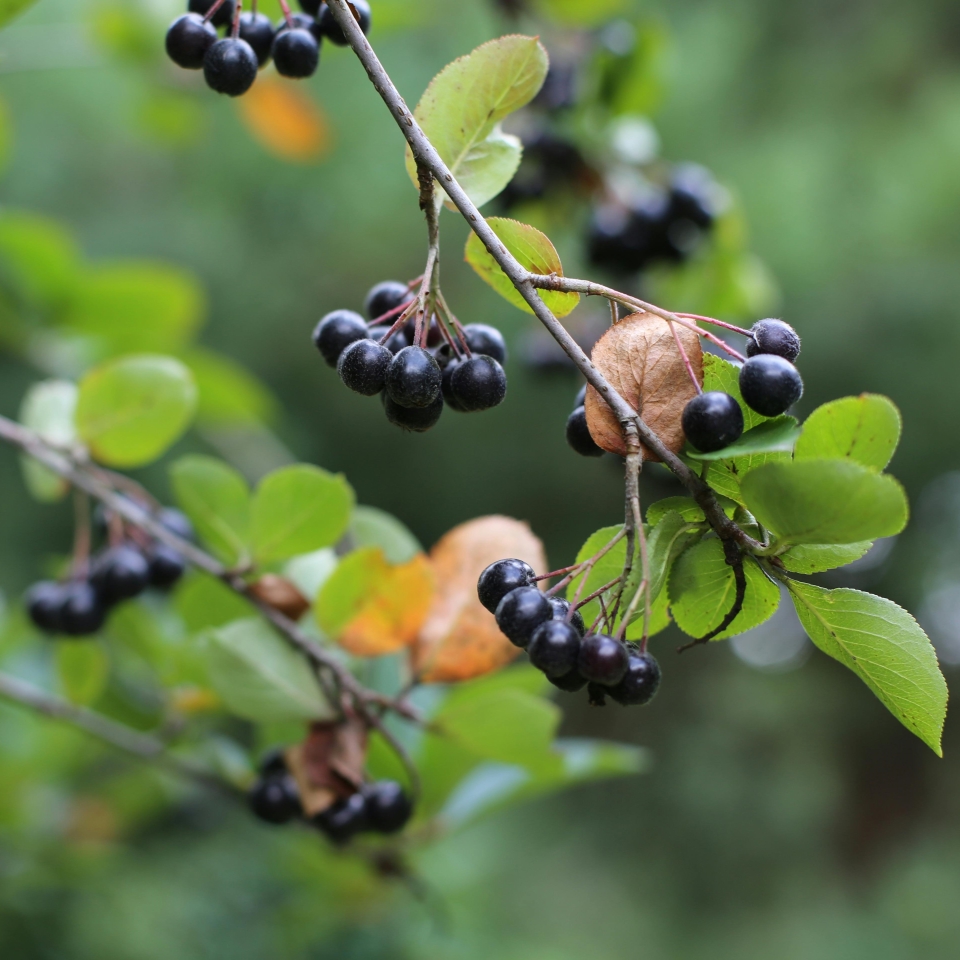 2️⃣ Арония черноплодная, плотная листва и летние ягоды;